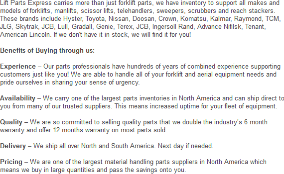 All our lift truck parts are offered at the best prices. Call today to get a quote on one of the attachments or parts we offer. We can be reached at:
